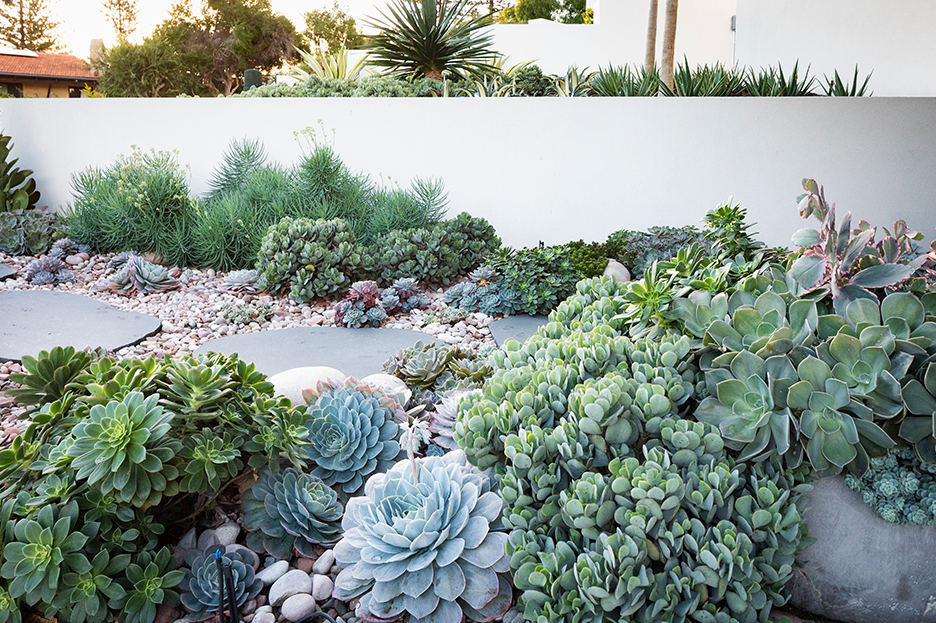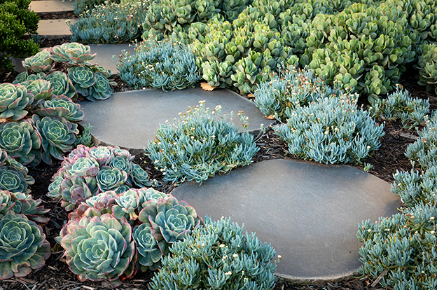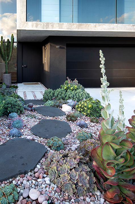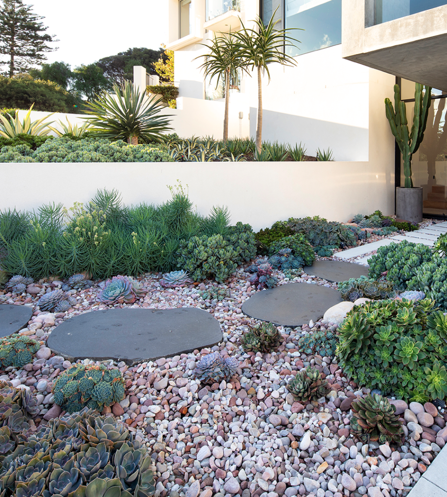 River stones compliment the muted tones of pretty clusters that frame the pathway with Echeverias and Crassula’s, while structural plants create a strong contrast, and make a statement as they stand proud.