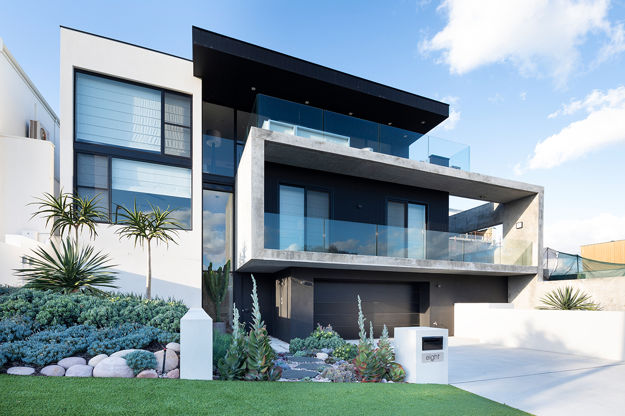 A delicate blend of soft and structural plants provide a striking backdrop to the clean lines of this home. Stepping stones allow you to experience the pretty lush foliage up close and personal as you make your way towards the entry.